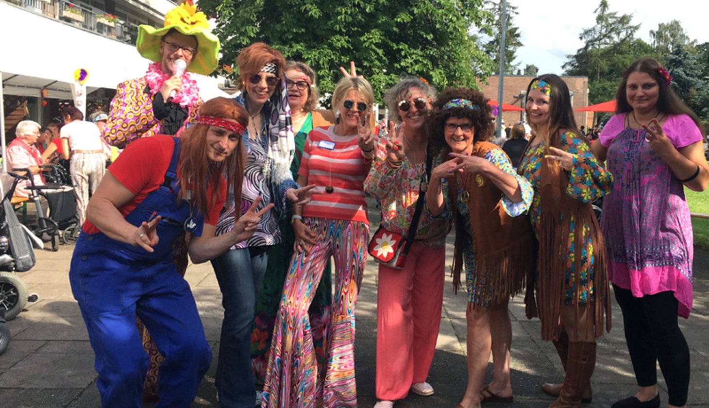 – bei der Flower-Power-Sommerparty im Senator-Neumann-Haus am vergangenen Freitag (15. August) gab es überaus kreative Kostüme zu bestaunen. Rund 300 Besucherinnen und Besucher feierten ausgelassen und bei viel Sonnenschein in der Einrichtung für Menschen mit Körperbehinderungen und neurologischen Erkrankungen in Hamburg-Bergstedt. Passend zum Festmotto heizte die Live-Band „Les Amis“ dem Publikum mit 1970er-Jahre-Hits und Schlager-Schmankerln wie „Aber bitte mit Sahne“ ein. An der Bar zogen farbenfrohe Säfte und Cocktails die Blicke auf sich, am Buffet gab es unter anderem ein Kult-Gericht, das sich im Deutschland der 1960er-Jahre großer Beliebtheit erfreute: Toast Hawai. Neben Nutzer*innen, Mitarbeiter*innen, An- und Zugehörigen sowie Menschen aus der Nachbarschaft waren auch die SPD-Politiker Regina Jäck und Peter Pape unter den Gästen.