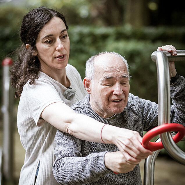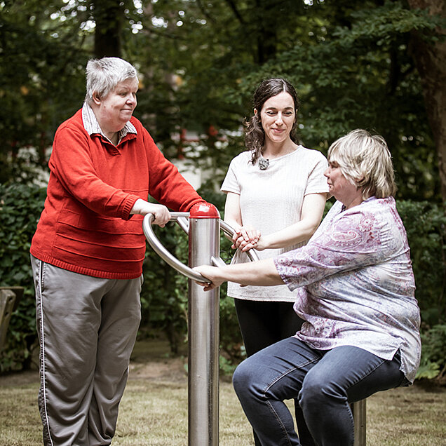 Was ist denn da los? Auf dem Gelände des Hilda Heinemann Hauses in Farmsen-Berne ist eine kleine Gruppe emsig am Drehen, Springen und Balancieren. Es sind Nutzer*innen der Angebote des Sozialkontors. Zusammen mit Assistenzkräften trainieren sie an der inklusiven Bewegungsinsel, die als Beitrag Hamburgs zu den Special Olympic World Games in Berlin 2023 entstand. Jetzt und in Zukunft können hier alle, die Lust haben, unter freiem Himmel Rücken, Schultern, Arme und Hände sowie Gleichgewicht und Geschicklichkeit stärken. Die Übungen sind zum Teil auch für Menschen im Rollstuhl geeignet und werden auf Info-Tafeln in Leichter Sprache erklärt. Probieren Sie es aus!