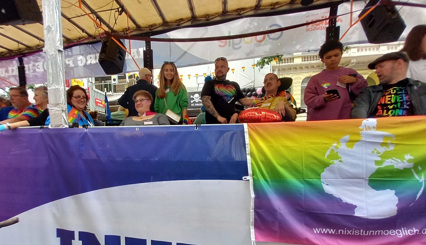 Die diesjährige Hamburg Pride Week stand ganz unter dem Motto: „Selbstbestimmung jetzt! Verbündet gegen Trans*feindlichkeit“. Los ging es in der Langen Reihe im Stadtteil St. Georg. Per Hebebühne wurden die Rollstühle auf den Lastwagen befördert. Gemeinsam mit rund 40 anderen Trucks und mit mehr als 100 Gruppen sowie Tausenden anderen Menschen zog der Inklusionstruck mehrere Stunden durch die Innenstadt bis zum Straßenfest am Jungfernstieg. Oben auf dem Truck hatte Nathalie noch mehr das Gefühl, etwas zum CSD beitragen zu können. „Das Gefühl dort sitzen zu dürfen, war unbeschreiblich. Die Menschen die den Truck gesehen haben waren voller Liebe und Begeisterung“, sagt sie.